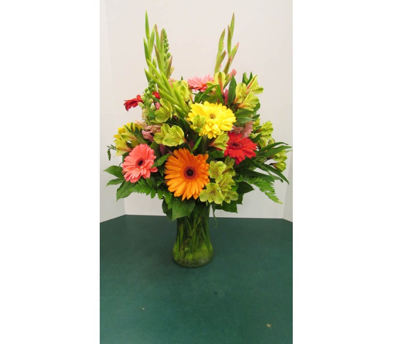 Vase Arrangement with Yellows, Oranges, Reds and Green